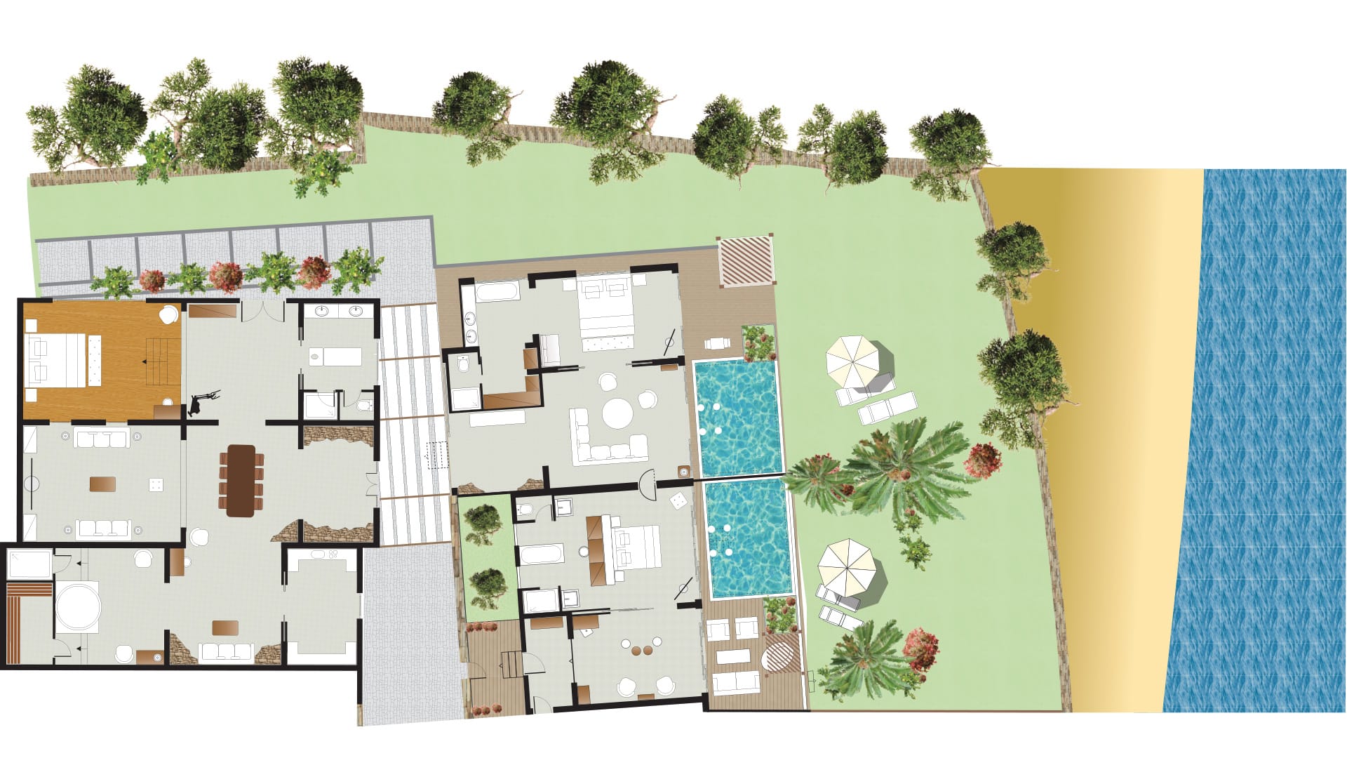 - BEDS: 1 oversized king size bed with direct sea view and direct access to the pool, 1 king size bed and 1 king size bed on a raised wooden floor